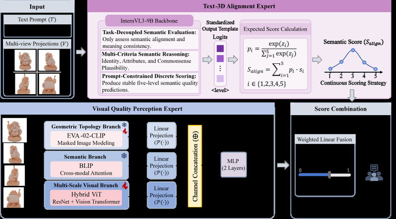 文生3D作为未来数字创作与虚拟环境构建的关键技术,在游戏、虚拟现实、影视特效等领域展现出广阔的应用前景。当前生成式3D内容(3DGC)普遍存在明显的质量问题,直接影响视觉保真度与用户体验。因此,3DGC质量评价已成为一项重要的新兴研究任务,对精准预测3DGC内容的感知质量、指导3D生成模型迭代优化、保障内容应用效果等具有重要意义。